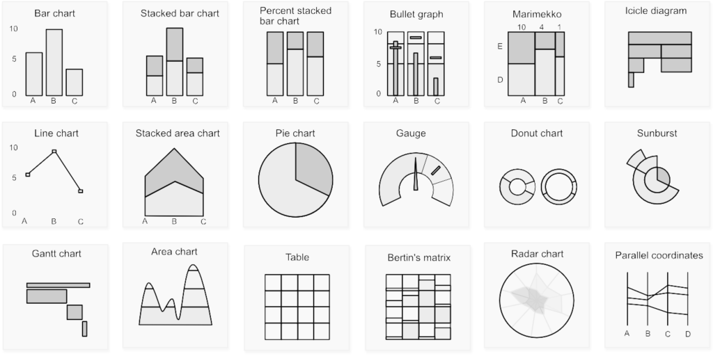 The specific chart or graph you select plays a huge role in clarifying or obscuring the story your data tells. Bar charts, scatter plots, area graphs, box plots, matrices, maps…which to use?